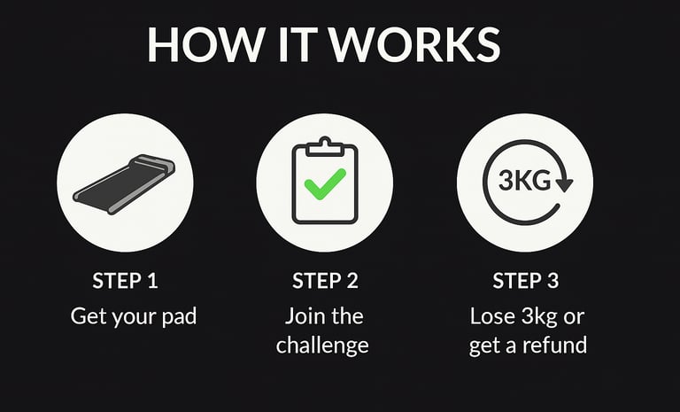 If you follow the 4-week challenge and don’t lose 3kg, we’ll give you a full refund — no drama, just show us your step tracking as proof.